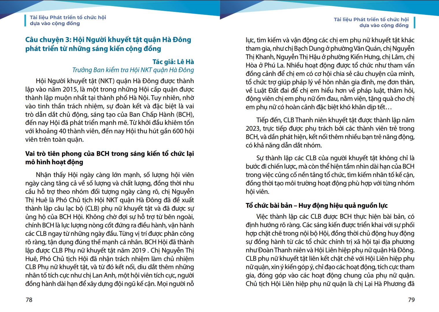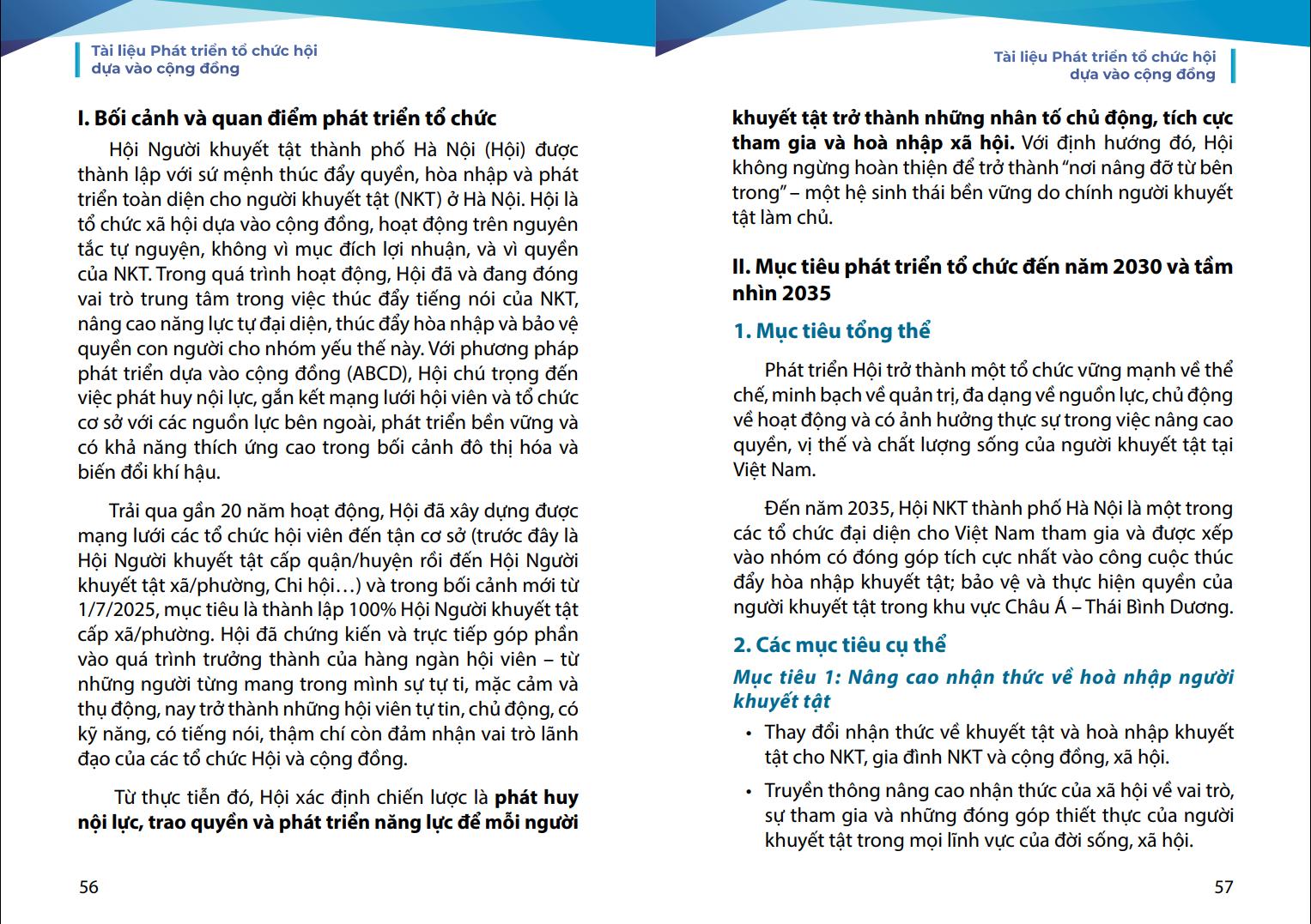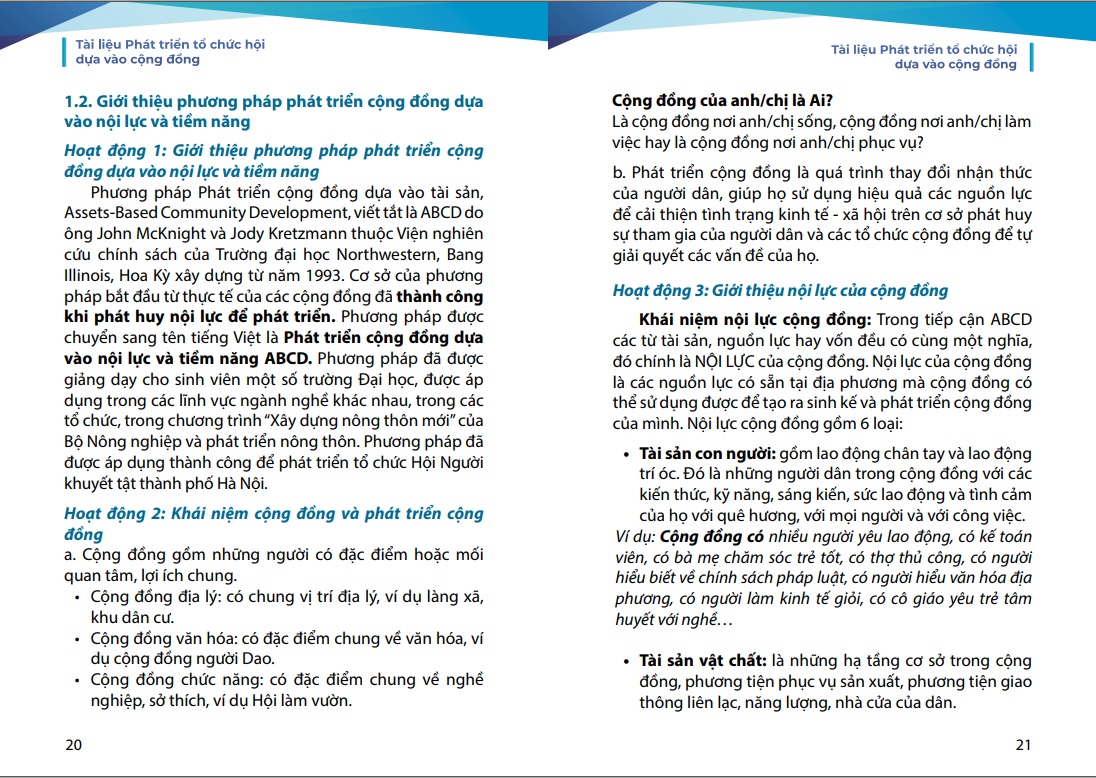 Nhằm hỗ trợ các tổ chức hội viên của Hội cũng như mong muốn chia sẻ kinh nghiệm về phát triển tổ chức của Hội tới các tổ chức của người khuyết tật trong cả nước và cán bộ Hội các cấp dễ dàng tiếp cận và áp dụng phương pháp ABCD vào thực tiễn công tác Hội, Hội Người khuyết tật thành phố Hà Nội đã biên soạn tài liệu “Phát triển tổ chức Hội dựa vào cộng đồng”. Đây là tài liệu thực hành tổng hợp, dựa trên nền tảng lý thuyết ABCD và kinh nghiệm thực tiễn triển khai tại Hội Người khuyết tật thành phố Hà Nội trong nhiều năm qua.
