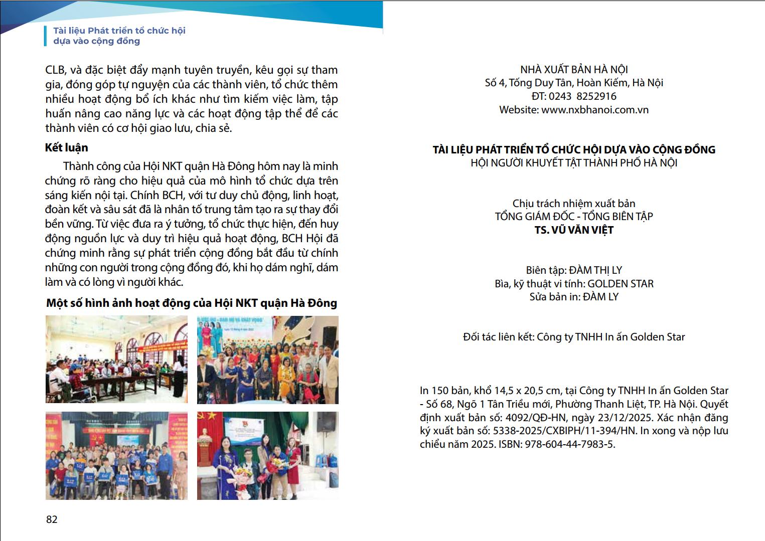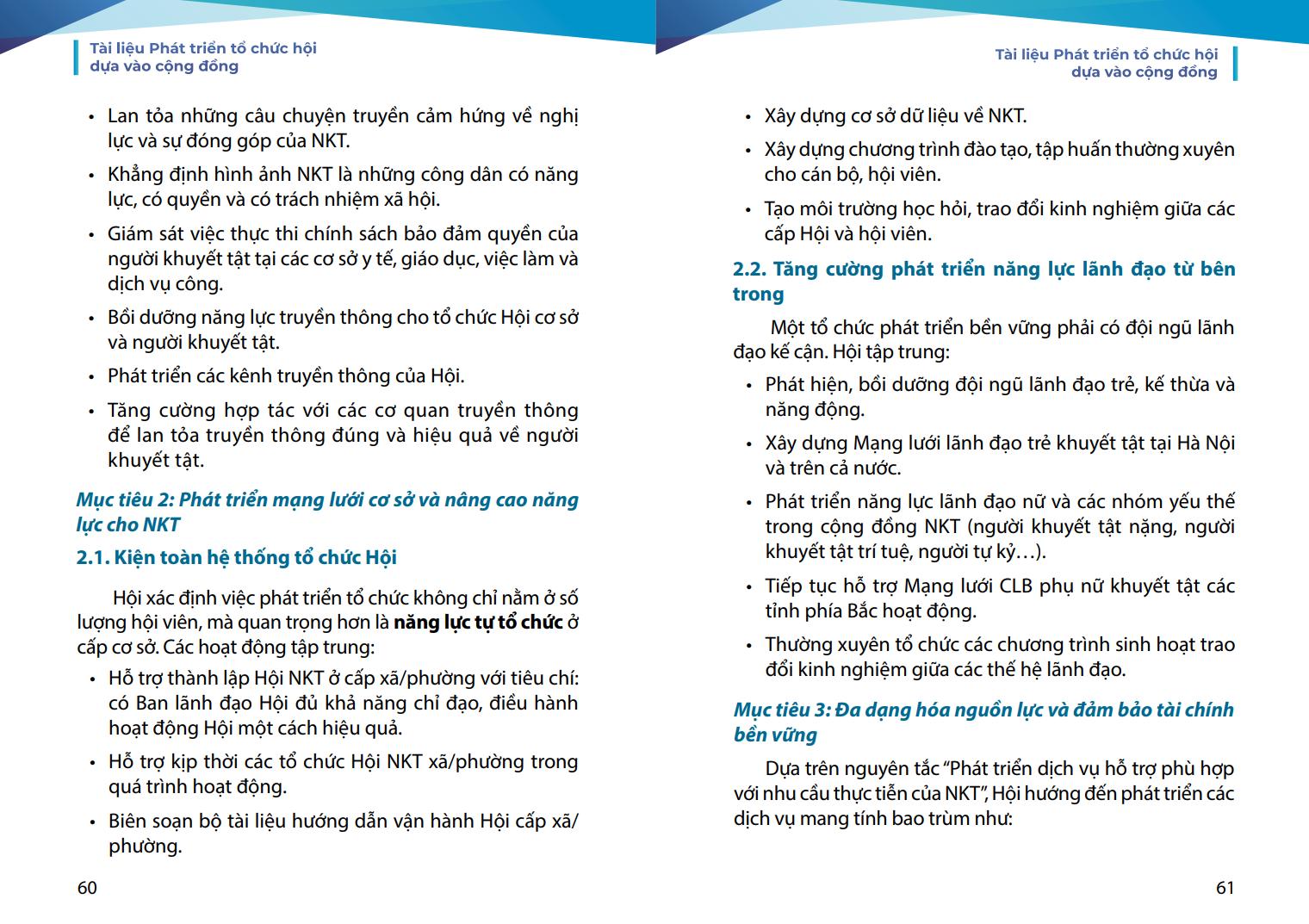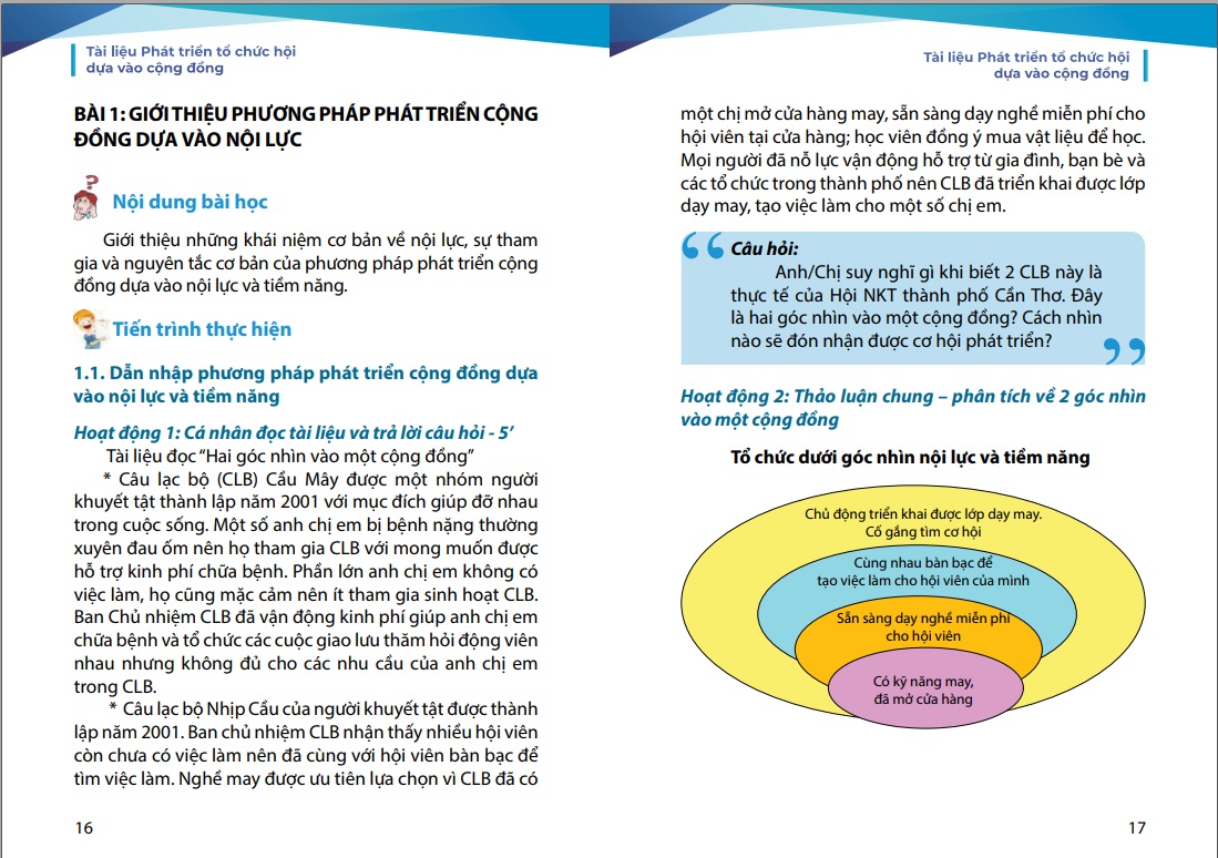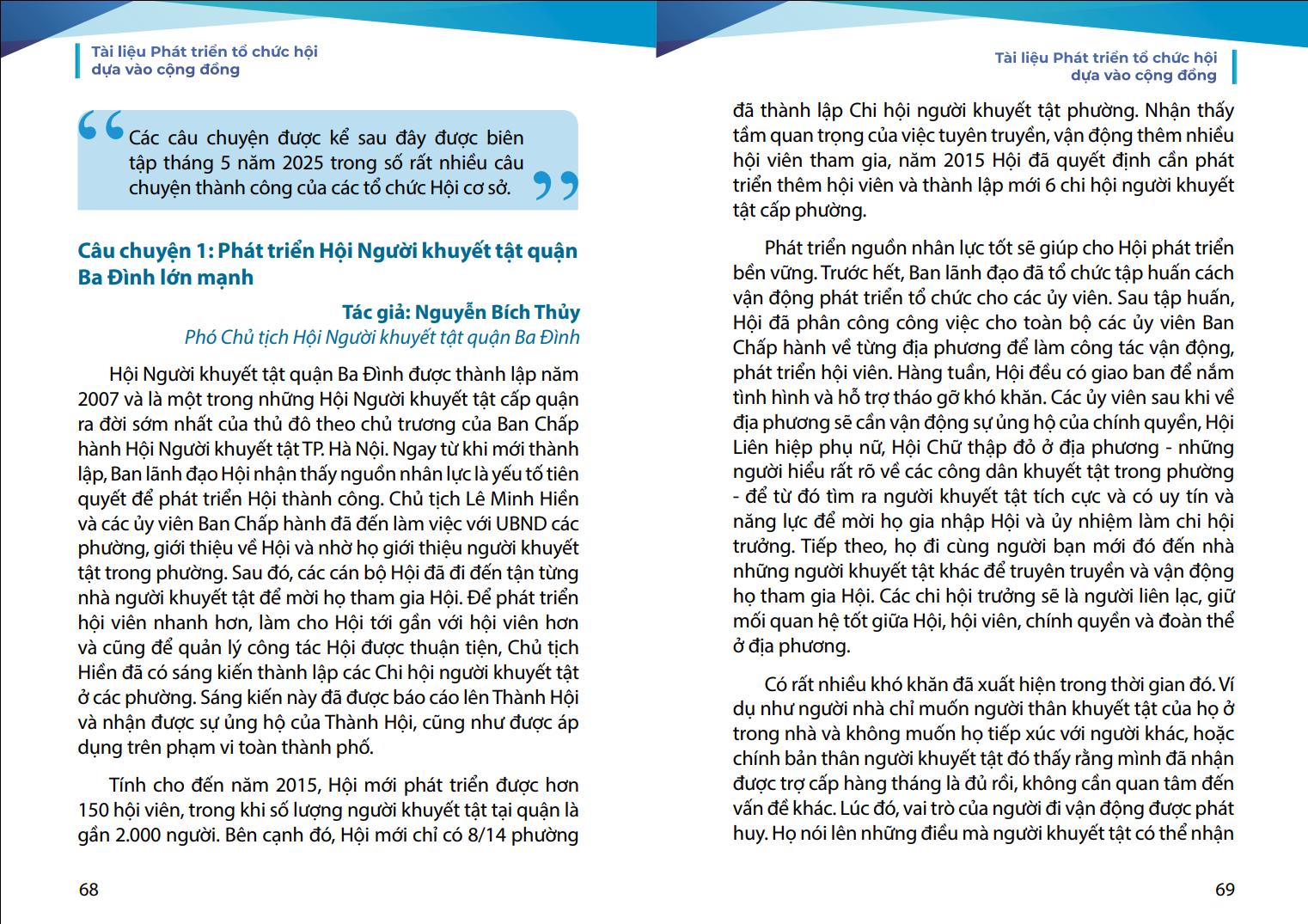 Nhằm hỗ trợ các tổ chức hội viên của Hội cũng như mong muốn chia sẻ kinh nghiệm về phát triển tổ chức của Hội tới các tổ chức của người khuyết tật trong cả nước và cán bộ Hội các cấp dễ dàng tiếp cận và áp dụng phương pháp ABCD vào thực tiễn công tác Hội, Hội Người khuyết tật thành phố Hà Nội đã biên soạn tài liệu “Phát triển tổ chức Hội dựa vào cộng đồng”. Đây là tài liệu thực hành tổng hợp, dựa trên nền tảng lý thuyết ABCD và kinh nghiệm thực tiễn triển khai tại Hội Người khuyết tật thành phố Hà Nội trong nhiều năm qua.