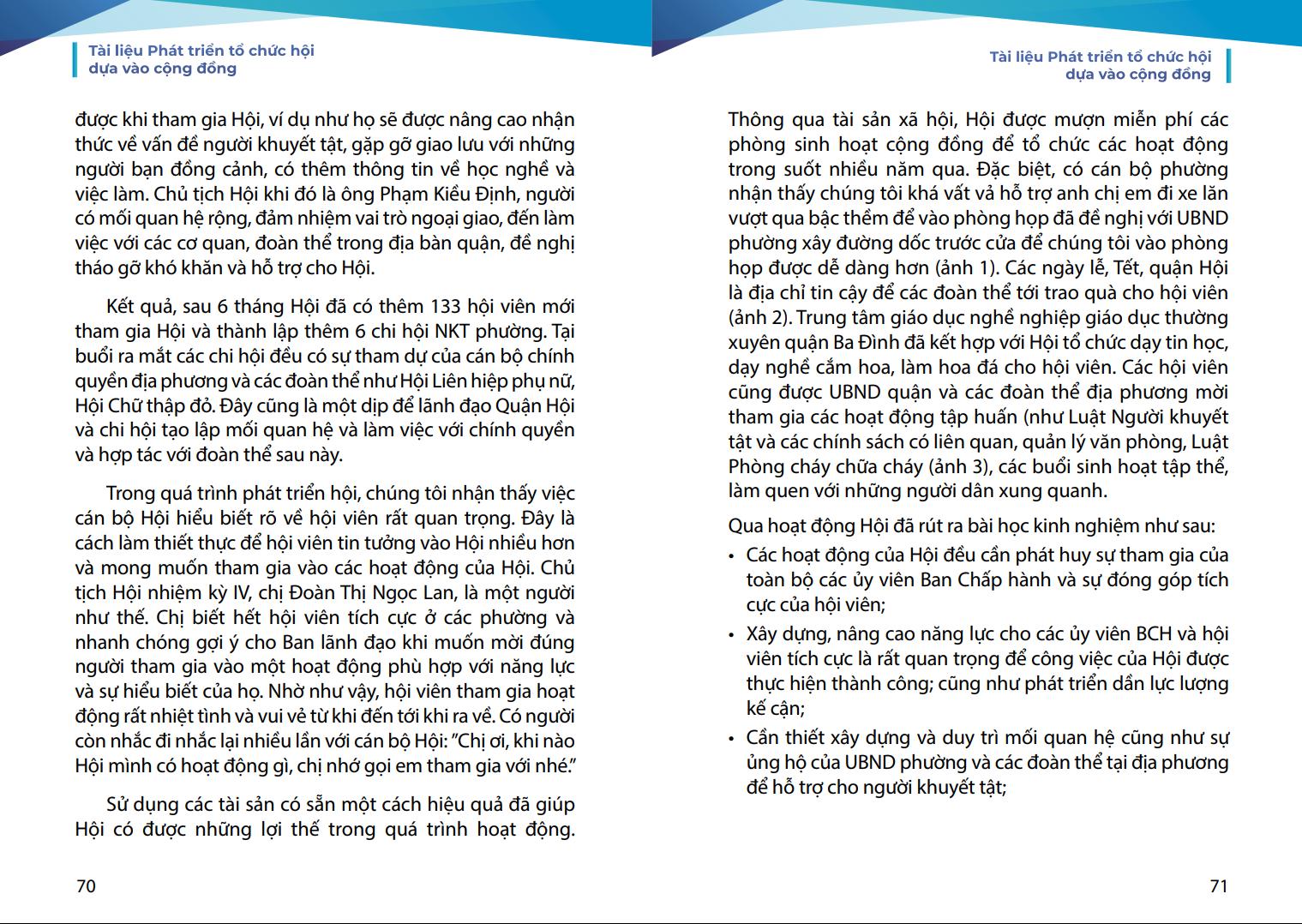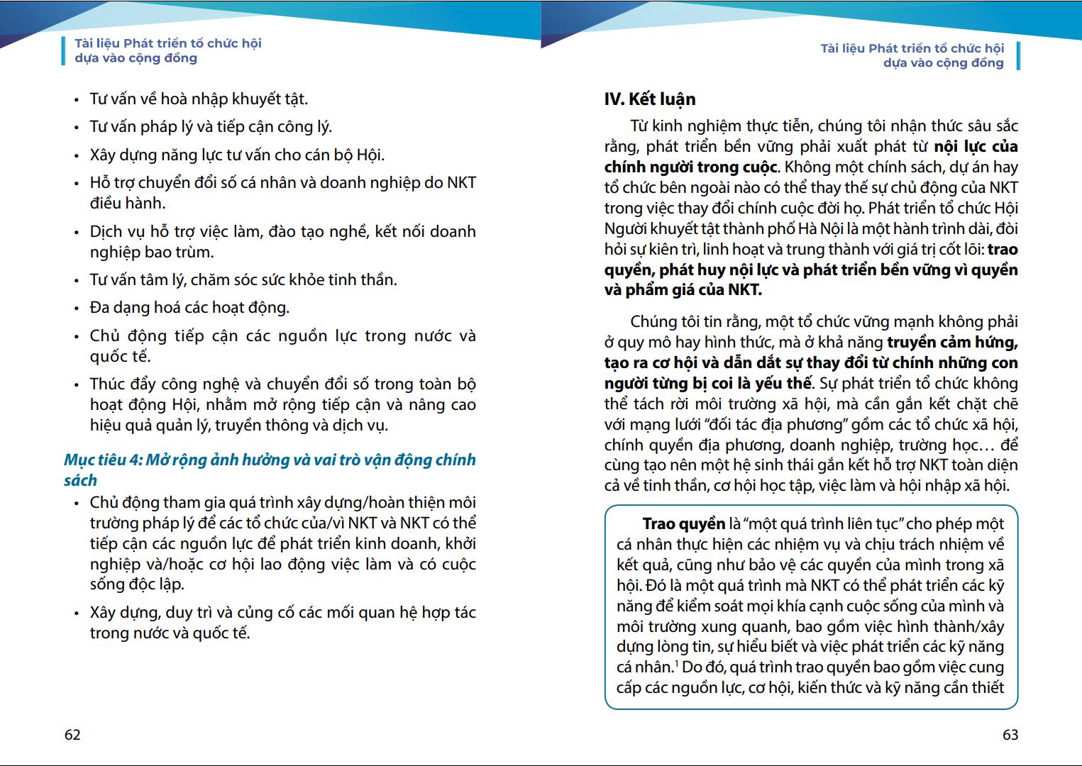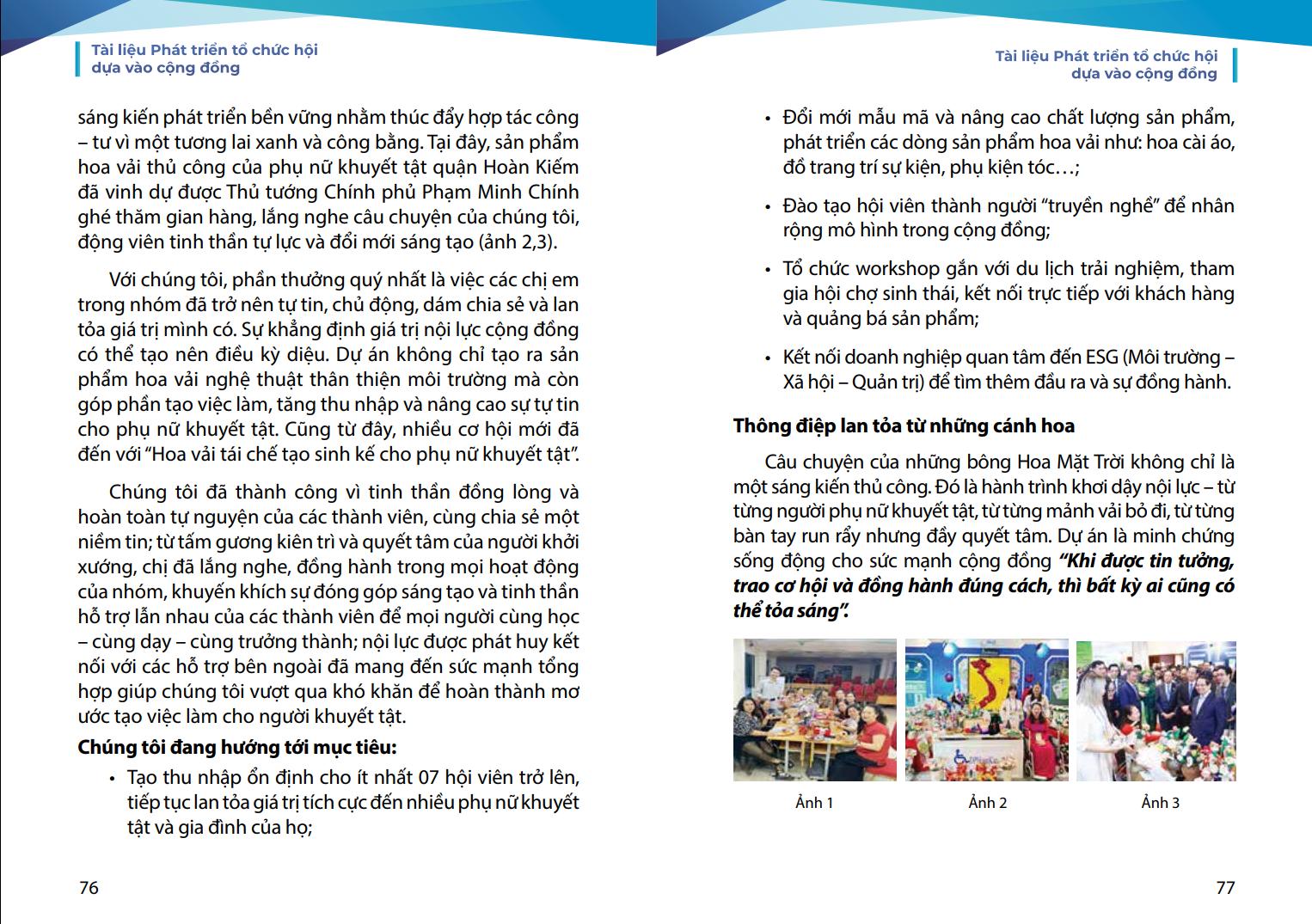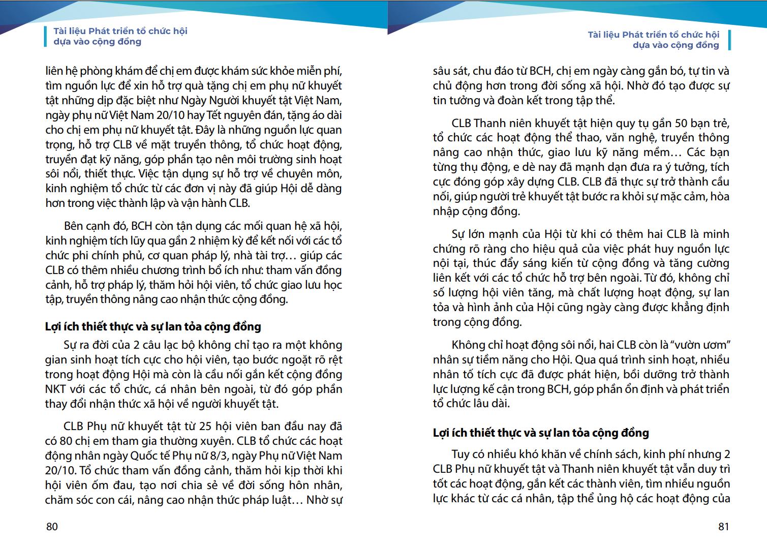 phương. Chúng tôi mong rằng, tài liệu này sẽ là người bạn đồng hành hữu ích của các cán bộ Hội và cộng đồng người khuyết tật trên hành trình phát huy nội lực và làm chủ cuộc sống.