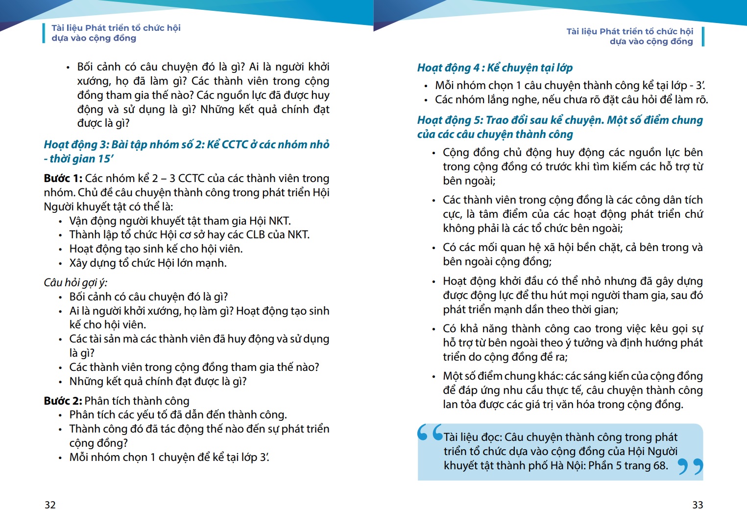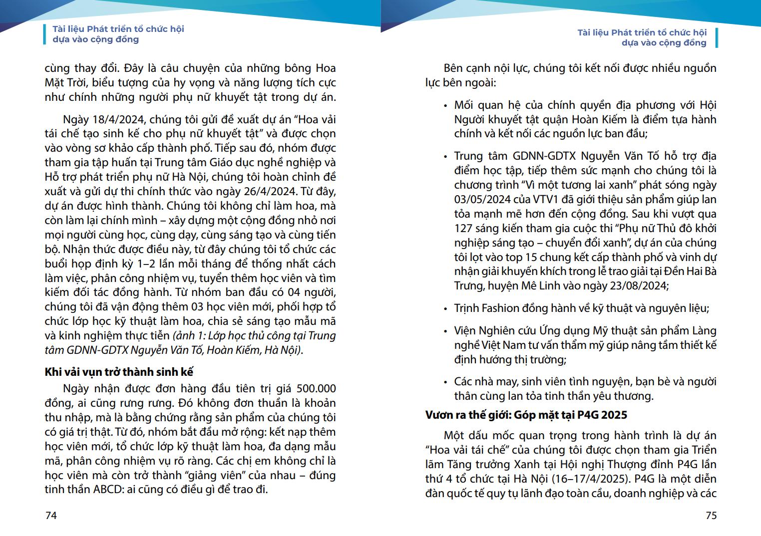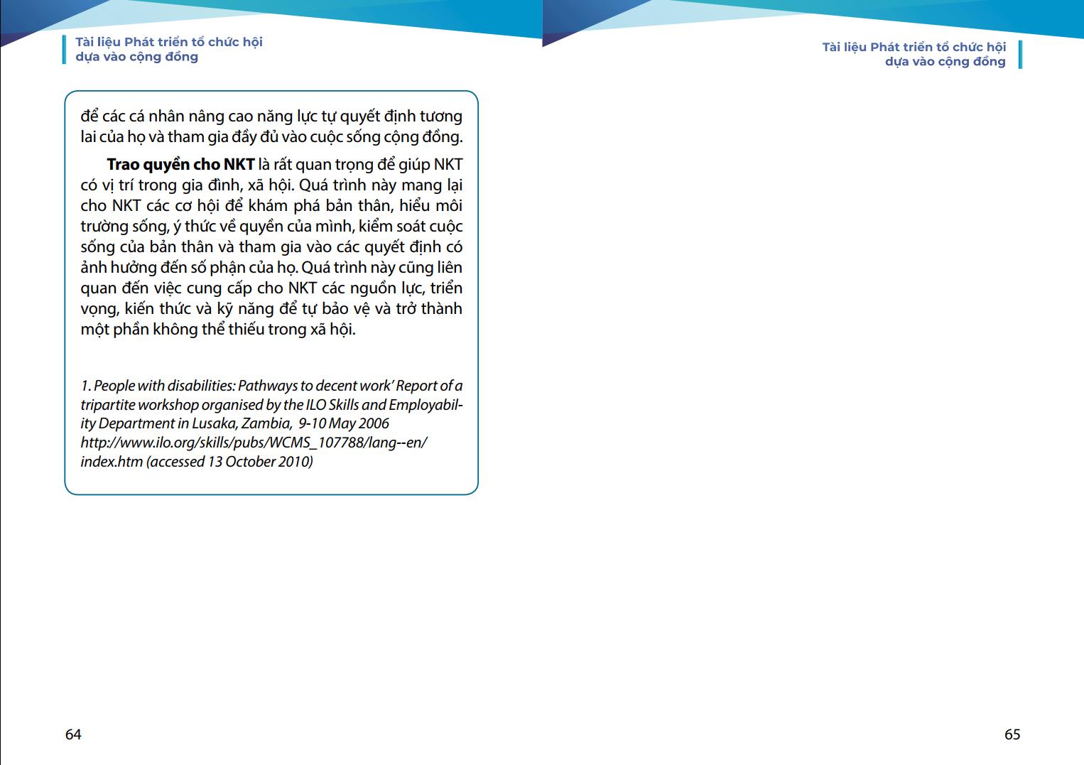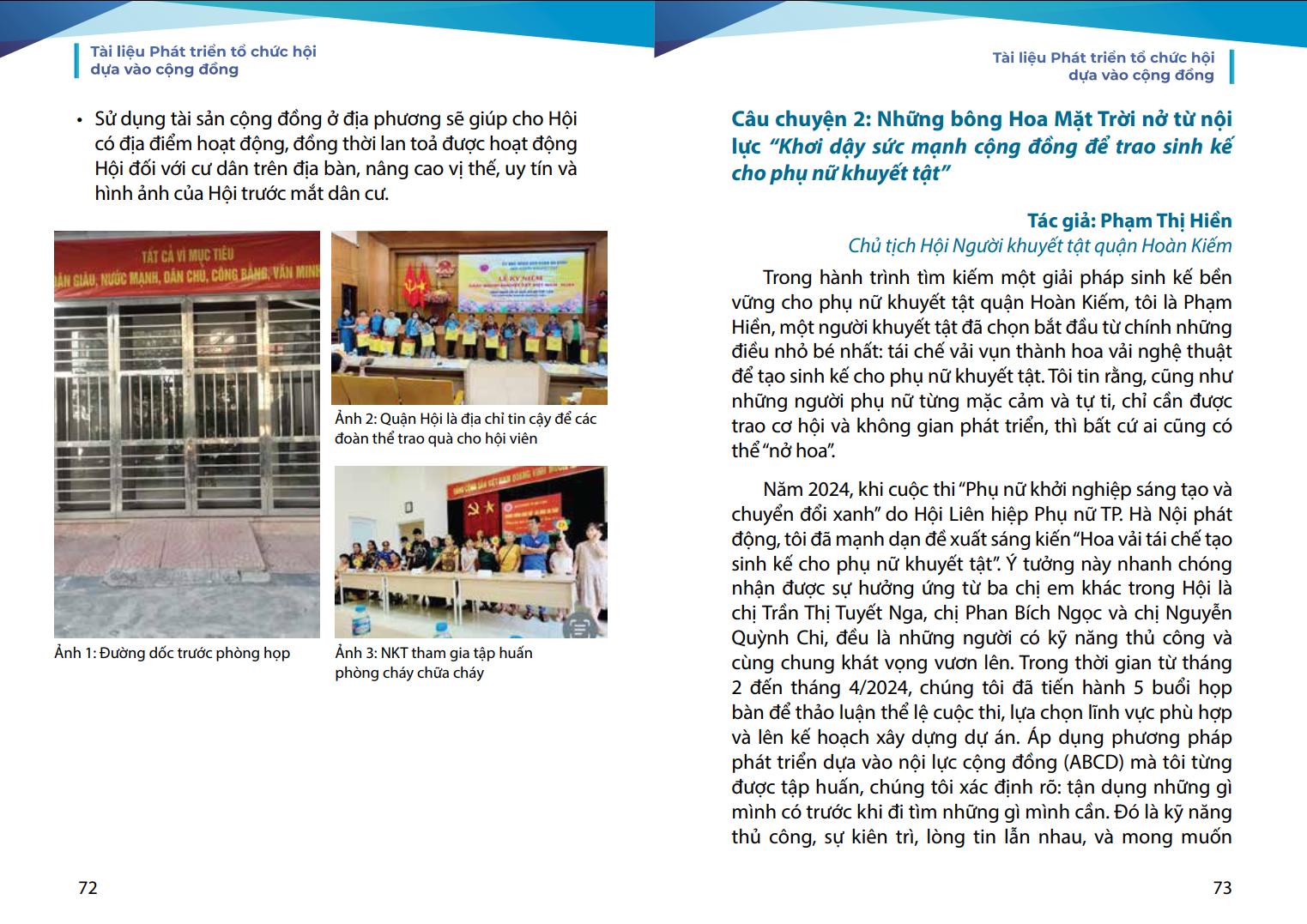 phương. Chúng tôi mong rằng, tài liệu này sẽ là người bạn đồng hành hữu ích của các cán bộ Hội và cộng đồng người khuyết tật trên hành trình phát huy nội lực và làm chủ cuộc sống.